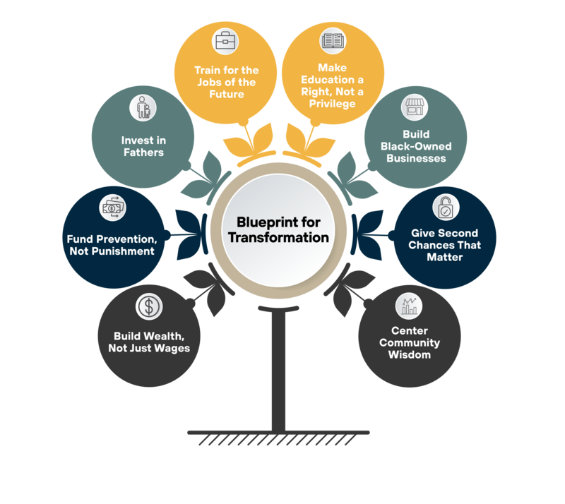 It highlights eight urgent pathways: building wealth, funding prevention, investing in fathers, training for future jobs, making education a right, supporting Black-owned businesses, ensuring second chances, and centering community wisdom.